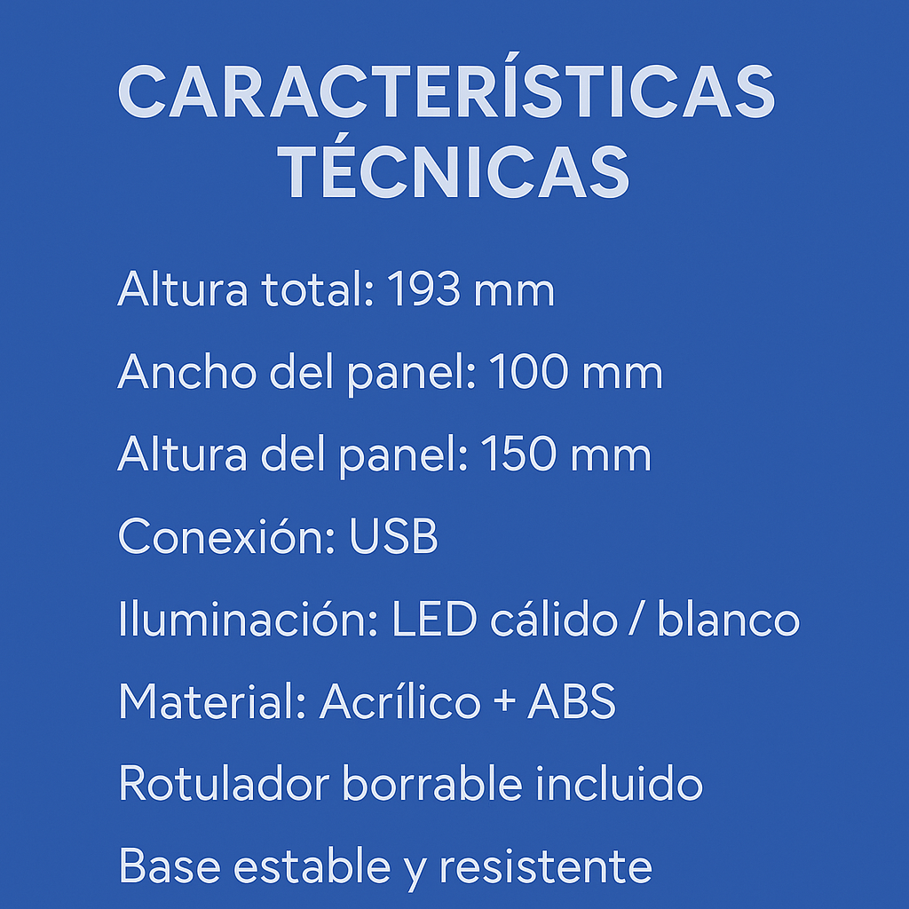 Además, trae un rotulador luminoso para escribir mensajes, recordatorios, frases motivadoras o dibujos directamente en la placa. Se limpia fácilmente y puedes reutilizarla todas las veces que quieras.